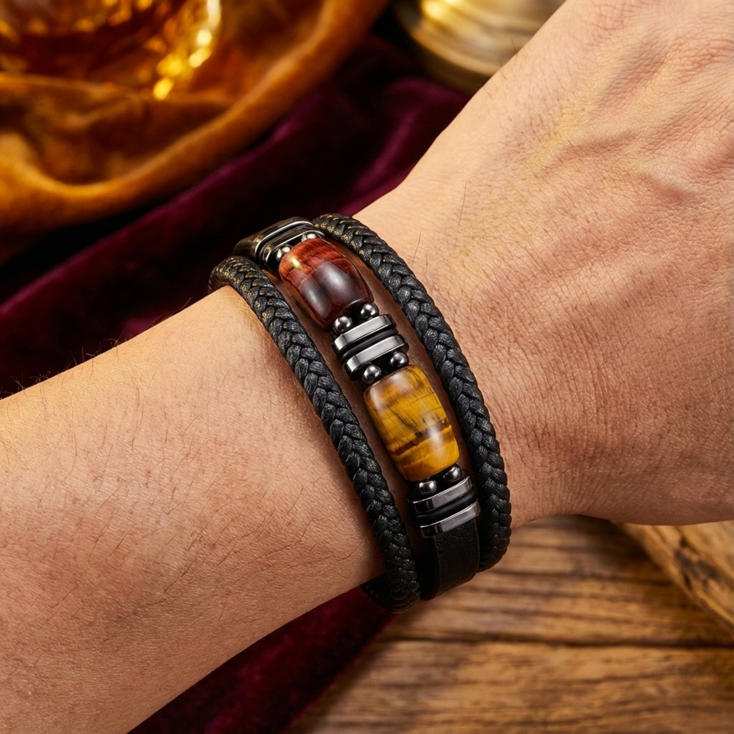This bracelet is crafted from high-quality black braided leather and features natural yellow and red stones. Each piece is carefully assembled for durability and style.